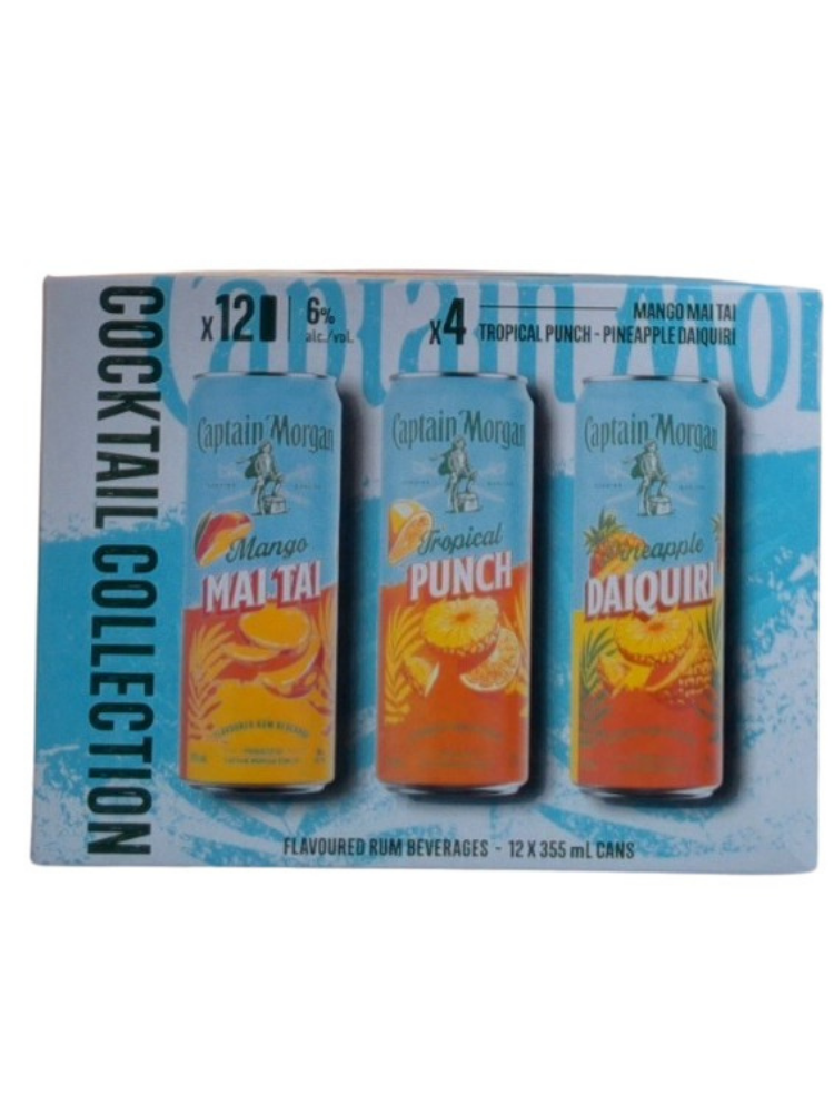 The Cocktail Collection Pack brings together three great ready-to-drink tropical cocktails in one pack. These balanced cocktails will transport you to the tropics. Included in the pack are 4 × 355mL cans of each of the following Captain Morgan cocktails, Pineapple Daquiri, Mango Mai Tai and Tropical Punch.