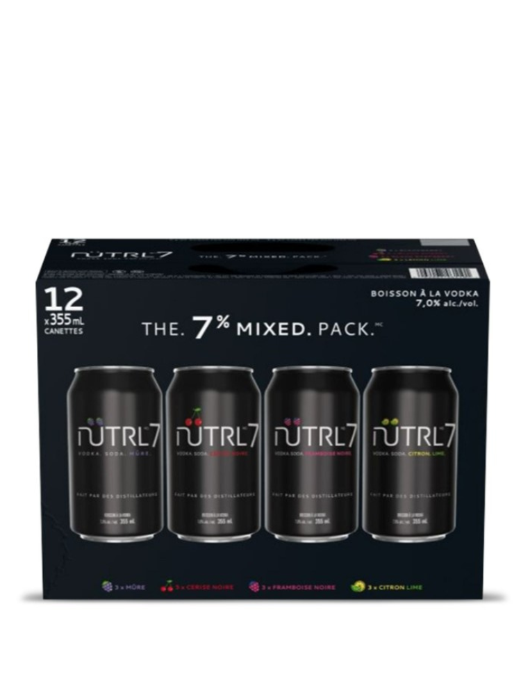 NÜTRL 7 is a refreshing Vodka Soda with 7% ABV, made with three ingredients, vodka, soda and natural flavours. It has zero carbohydrates and zero sugar. This mixed pack contains 3 × 355mL individual cans of Blackberry, Black Cherry, Black Raspberry, and Lemon Lime. Perfect for all your summer gatherings!